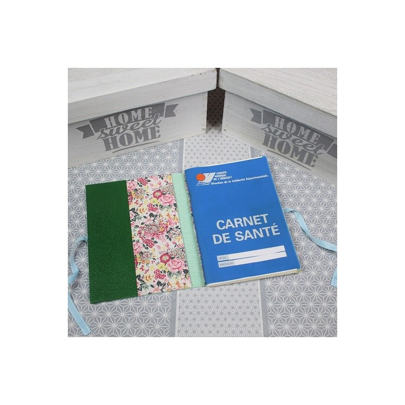 Protège carnet de santé, réalisé en papier simili cuir et tissu.