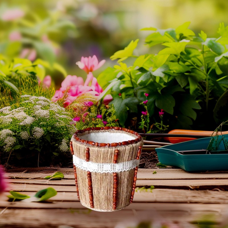 Cache pot fait main en bois, corde de jute, dentelle et perles.