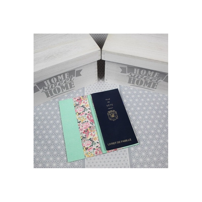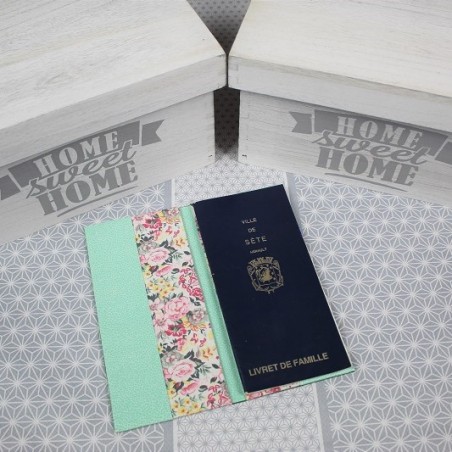 Protège livret de famille, réalisé en papier simili cuir et tissu.