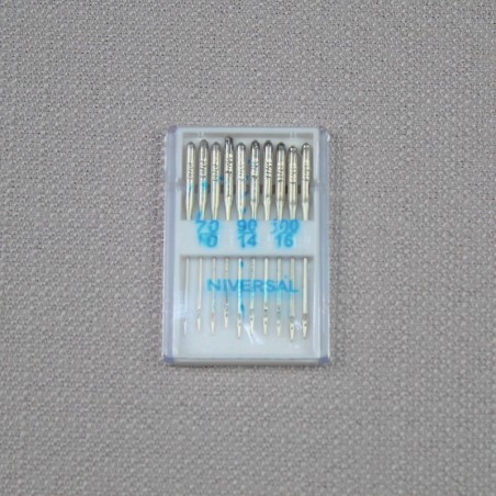 Boite de 10 aiguilles de machine a coudre Universelles, a talon plat, de taille 70/10 - 90/14 - 100/16 en acier inoxydable.